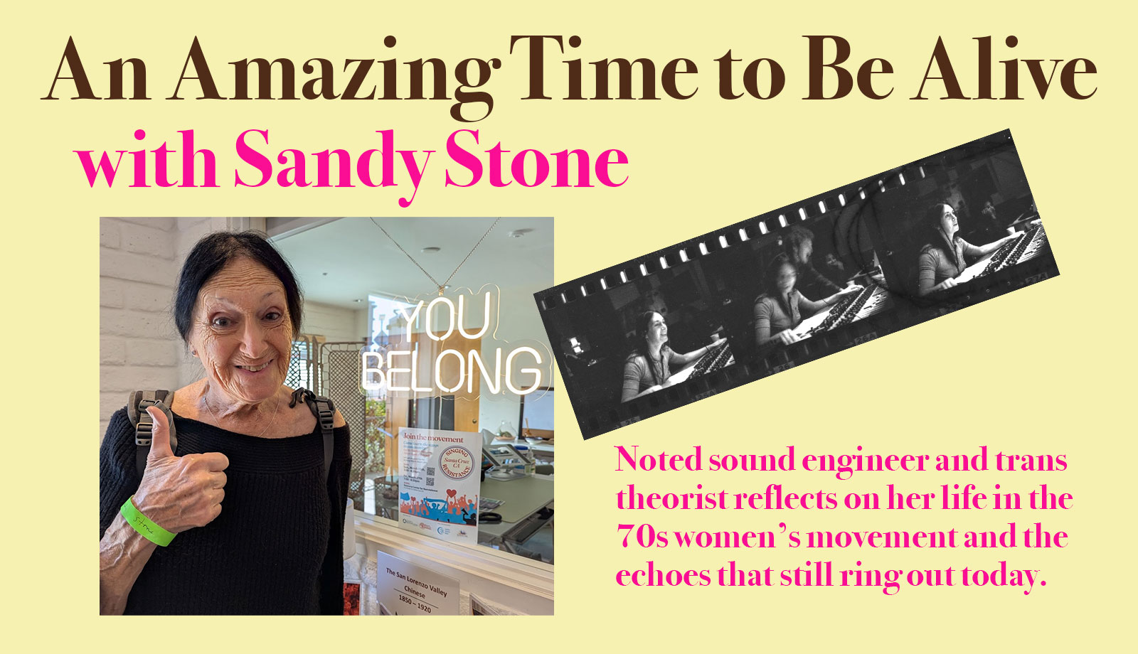 Sandy Stone landed in Santa Cruz, California in 1973, looking for a safe place to transition her gender. The Santa Cruz of her generation, as she describes it, was “weirder by orders of magnitude” than the left coast towns of today. She set up a business, the Wizard of Aud, and went about her life.