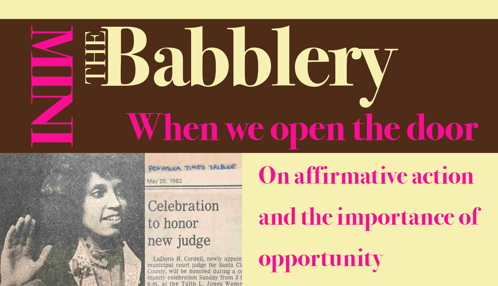 This month’s guest on the Babblery podcast is retired judge LaDoris Hazzard Cordell. I first interviewed LaDoris about her work with the African American Composer Initiative. In both interviews, she gives a passionate defense of what she calls today’s “dirty word”—DEI. In this Minibabble, producer Suki Wessling reflects on what it means to hold the door open for others.